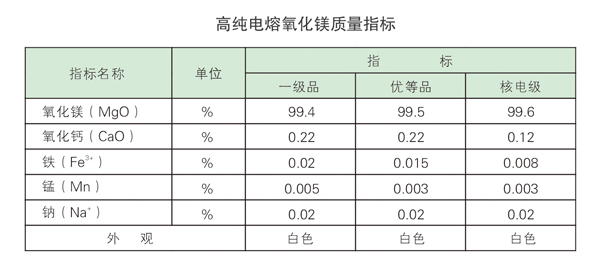 我公司高純電熔氧化鎂制作采用氧化鎂(苦鹵)和碳酸鈉(純堿)化學合成制得的試劑級高純氧化鎂(海水鎂)經3300度電熔爐熔煉而成。此工藝制得的電熔氧化鎂純度高(可達99.9%),密度大(3.57g/ml)、晶體透明度好,具有優良的電絕緣性和熱傳導性(60W/mk),主要用于國防軍工、耐火材料、電熱電器、鎧裝偶絲等行業,產品質量各項指標達到或超過美國日本同類產品水平。年產量280噸。